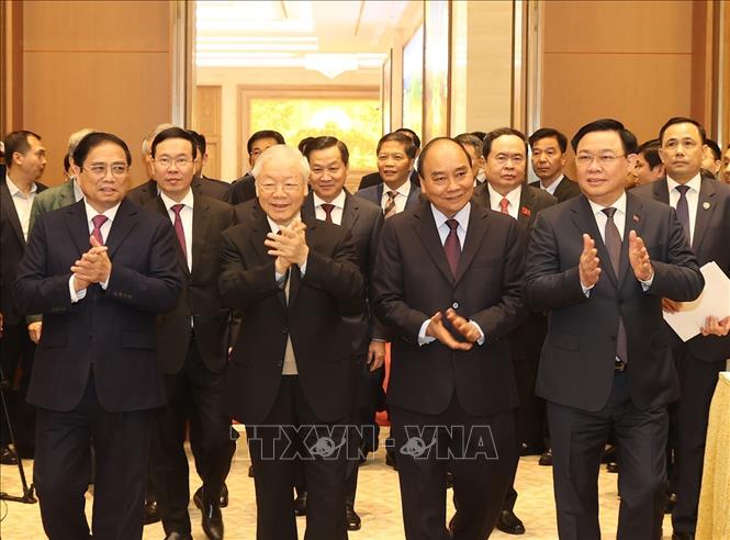 Chủ tịch nước Nguyễn Xuân Phúc, Chủ tịch Quốc hội Vương Đình Huệ, Thường trực Ban Bí thư Võ Văn Thưởng cùng các đồng chí lãnh đạo Đảng, Nhà nước, Mặt trận Tổ quốc Việt Nam; lãnh đạo các ban, bộ ngành ở Trung ương tham dự hội nghị.