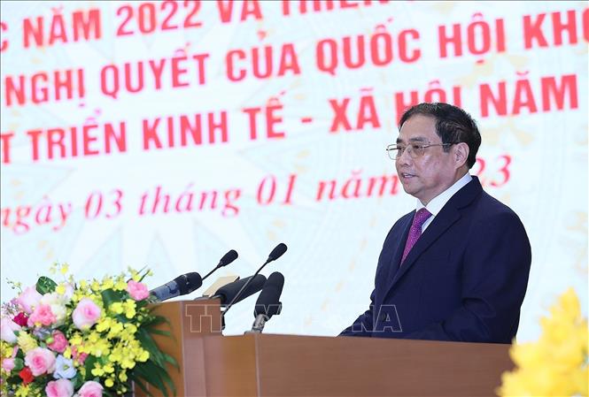 Thủ tướng Phạm Minh Chính phát biểu khai mạc hội nghị triển khai kế hoạch phát triển kinh tế-xã hội năm 2023. Ảnh: Dương Giang/TTXVN