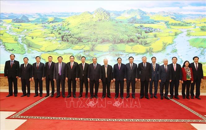 Tổng Bí thư Nguyễn Phú Trọng; Chủ tịch nước Nguyễn Xuân Phúc; Chủ tịch Quốc hội Vương Đình Huệ; Thủ tướng Phạm Minh Chính và các Phó Thủ tướng dự, chủ trì và điều hành hội nghị. Ảnh: Dương Giang/TTXVN