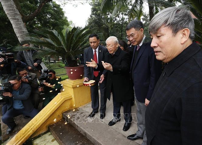 Sau khi nghe báo cáo tình hình, Tổng Bí thư Nguyễn Phú Trọng hoan nghênh cán bộ, nhân viên Khu di tích đã cố gắng làm tốt công việc được giao, gìn giữ, bảo quản và giới thiệu với đồng bào trong nước, du khách quốc tế những tư liệu, hiện vật quý về cuộc đời và sự nghiệp hoạt động cách mạng của Chủ tịch Hồ Chí Minh.