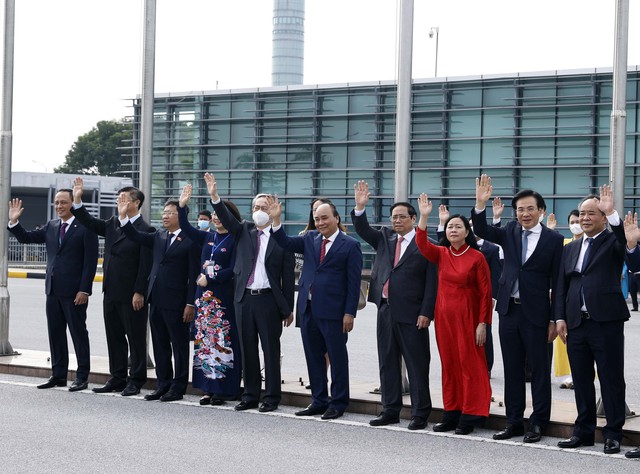 Chủ tịch nước Nguyễn Xuân Phúc, Thủ tướng Chính phủ Phạm Minh Chính và các đồng chí Lãnh đạo Đảng, Nhà nước ra sân bay tiễn Tổng Bí thư Nguyễn Phú Trọng và Đoàn.