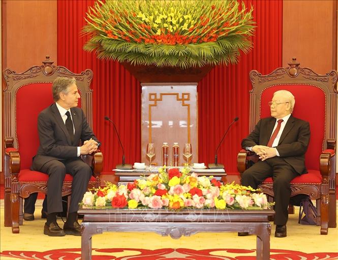 Ngoại trưởng Antony Blinken bày tỏ vinh dự và cảm ơn Tổng Bí thư đã dành thời gian tiếp Ngoại trưởng, chuyển lời thăm hỏi của Tổng thống Joe Biden đến Tổng Bí thư Nguyễn Phú Trọng, chia sẻ Hoa Kỳ đánh giá cao thành công của cuộc điện đàm giữa hai nhà Lãnh đạo. Ngoại trưởng Antony Blinken cũng chia sẻ đánh giá về sự phát triển toàn diện, thực chất của quan hệ Đối tác Toàn diện Việt Nam - Hoa Kỳ trong những năm qua, trao đổi nội dung của các cuộc làm việc trong chuyến thăm Việt Nam, nhấn mạnh cam kết của Hoa Kỳ tăng cường hợp tác với Việt Nam trong các lĩnh vực, nhất là thương mại - đầu tư, khoa học - công nghệ, giáo dục – đào tạo, ứng phó với biến đổi khí hậu. Ngoại trưởng Antony Blinken nhấn mạnh cơ sở và các nguyên tắc trong quan hệ Việt Nam - Hoa Kỳ như Tổng Bí thư đã nêu và được khẳng định tại cuộc điện đàm, tái khẳng định Hoa Kỳ coi trọng quan hệ với Việt Nam, mong muốn đưa quan hệ lên tầm cao mới.