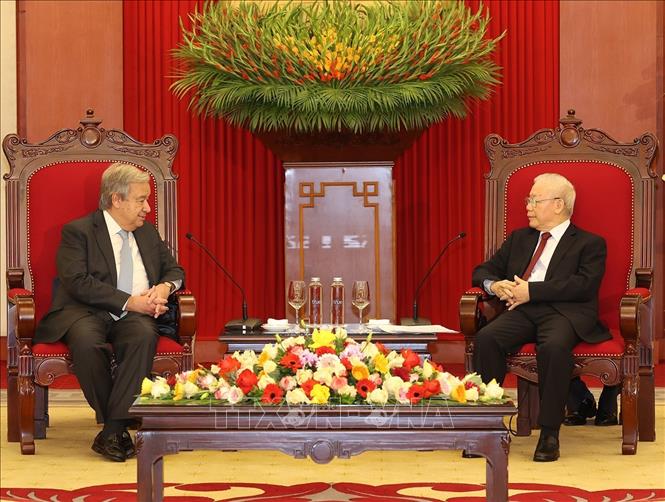 Tổng Bí thư Nguyễn Phú Trọng đã đánh giá cao chuyến thăm của ngài Tổng Thư ký António Guterres, đặc biệt đúng vào dịp kỷ niệm 45 năm Việt Nam trở thành thành viên chính thức của Liên hợp quốc, có ý nghĩa rất quan trọng đối với quan hệ giữa Việt Nam và Liên hợp quốc đang phát triển tốt đẹp.
