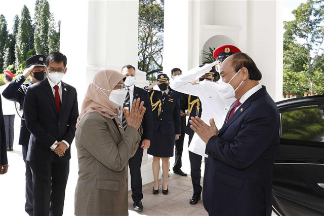 Tổng thống Singapore Halimah Yacob và Phu quân đón Chủ tịch nước Nguyễn Xuân Phúc và Phu nhân tại khu vực sảnh chính Cung Istana. Tiếp đó, Chủ tịch nước Nguyễn Xuân Phúc và Tổng thống Halimah Yacob cùng bước lên bục danh dự.