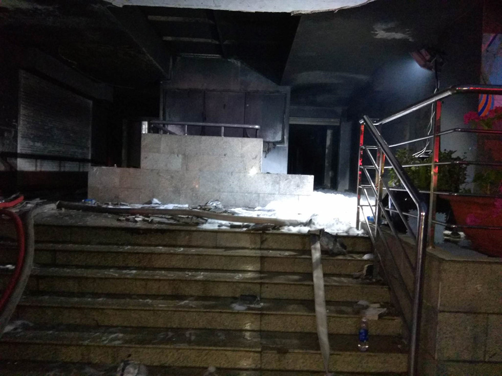 Ngọn lửa bùng phát nhanh khiến nhiều mảng bêtông sụp, khói phủ kín khu vực.