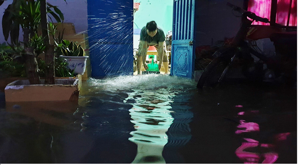 Vào 3h sáng ngày 9/10, triều cường dâng cao khiến hàng loạt hộ dân có nền nhà thấp ở bán đảo Thanh Đa, quận Bình Thạch (TP.HCM), bị nước tràn vào. Người dân phải thức dậy giữa khuya, lấy ván cùng nhiều vật dụng khác ngăn không cho nước tràn vào nhà vừa tát nước ra ngoài.