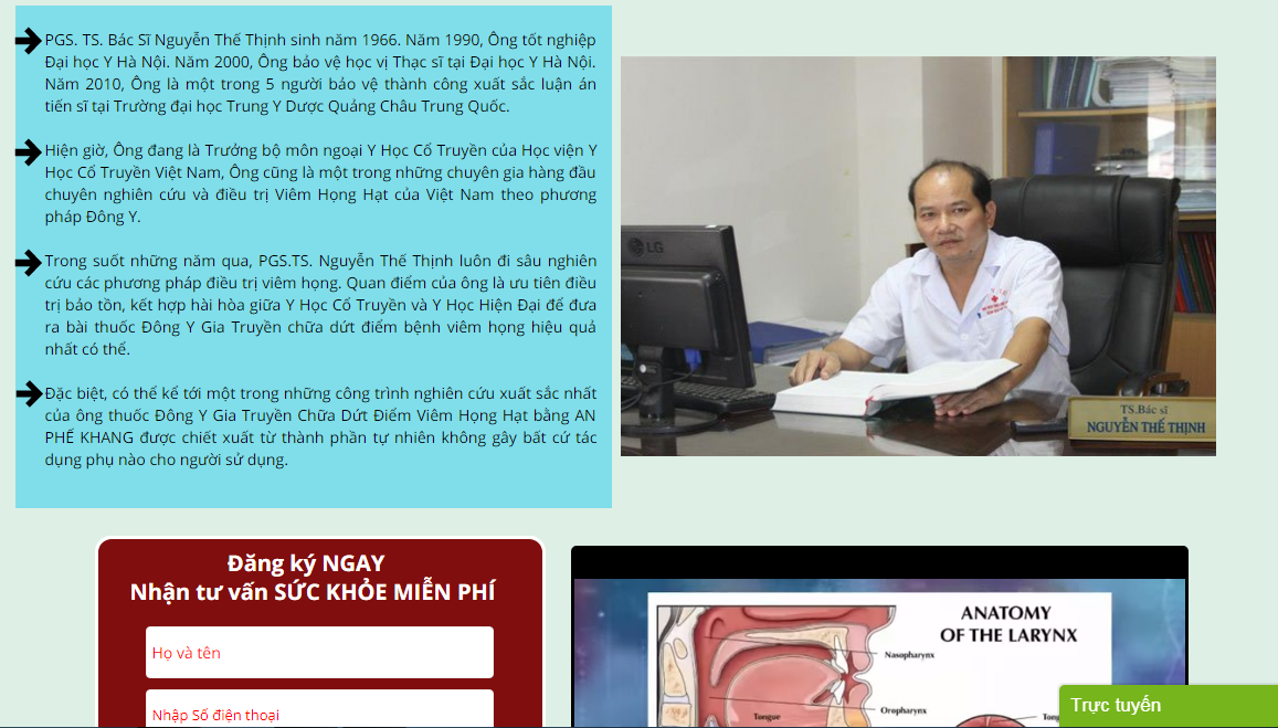 Nghiêm trọng hơn, theo lời giới thiệu trên trang tridutdiemviemhong.com, sản phẩm An Phế Khang được mượn lời người khác quảng cáo có thể đặc trị chữa được viêm họng như: “Trong suốt những năm qua, PGS.TS. Nguyễn Thế Thịnh luôn đi sâu nghiên cứu các phương pháp điều trị viêm họng. Quan điểm của ông là ưu tiên điều trị bảo tồn, kết hợp hài hòa giữa Y học Cổ truyền và Y học hiện đại để đưa ra bài thuốc Đông Y Gia Truyền chữa dứt điểm bệnh viêm họng hiệu quả nhất có thể. Đặc biệt, có thể kể tới một trong những công trình nghiên cứu xuất sắc nhất của ông thuốc Đông y gia truyền chữa dứt điểm viêm họng hạt bằng An phế khang được chiết xuất từ thành phần tự nhiên, không gây bất cứ tác dụng phụ nào cho người sử dụng”.