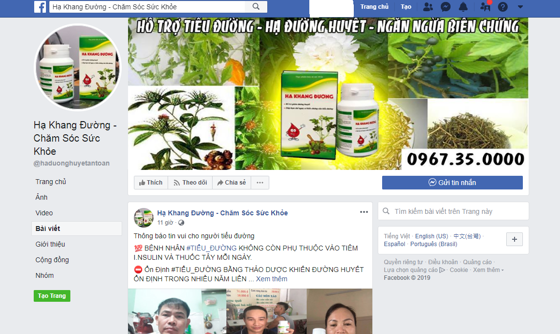 Cụ thể, thông tin quảng cáo đã xuất hiện trên các website như: http://giamduong2.meohay.xyz/; http://tieuduongadw.songvui.xyz/; https://www.facebook.com/pg/haduonghuyetantoan/posts/; http://dutdiemtieuduong.suckhoecuocsong365.com/