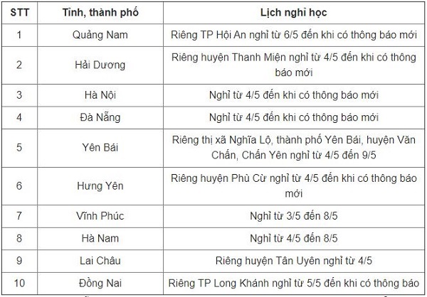Trong khi đó, tính đến chiều 5/5, cả nước đã có 10 tỉnh, thành phố quyết định cho học sinh tạm nghỉ đến trường để đảm bảo an toàn khi dịch COVID-19 diễn biến phức tạp.