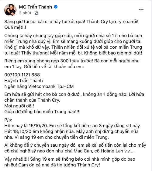 Theo đó, Trấn Thành viết: "Nay đọc về miền Trung và những câu chuyện thương tâm thấy xót quá! Thành Cry lại cry nữa rồi! Quá mệt! Chúng ta hãy chung tay góp sức, mỗi người chia sẻ 1 ít cho bà con miền Trung nha quý vị. Em sẽ mang xuống dưới giúp cho người ta. Khổ gì mà khổ dữ vậy. Thiên nhiên đối xử tệ với bà con miền Trung tôi quá! Thấy thương! Mỗi năm mỗi bị. Không biết bao giờ mới dứt! Riêng em xung phong góp 300 triệu trước! Bà con mỗi người phụ em 1 tay".
