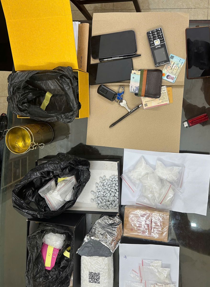 Quá trình bắt và khám xét, lực lượng Công an thu giữ 1,4kg heroin, 2kg ketamine, 1 kg ma túy đá, 500 viên ma túy tổng hợp, 100 viên hồng phiến, 5 điện thoại di động cùng một số vật chứng khác có liên quan.