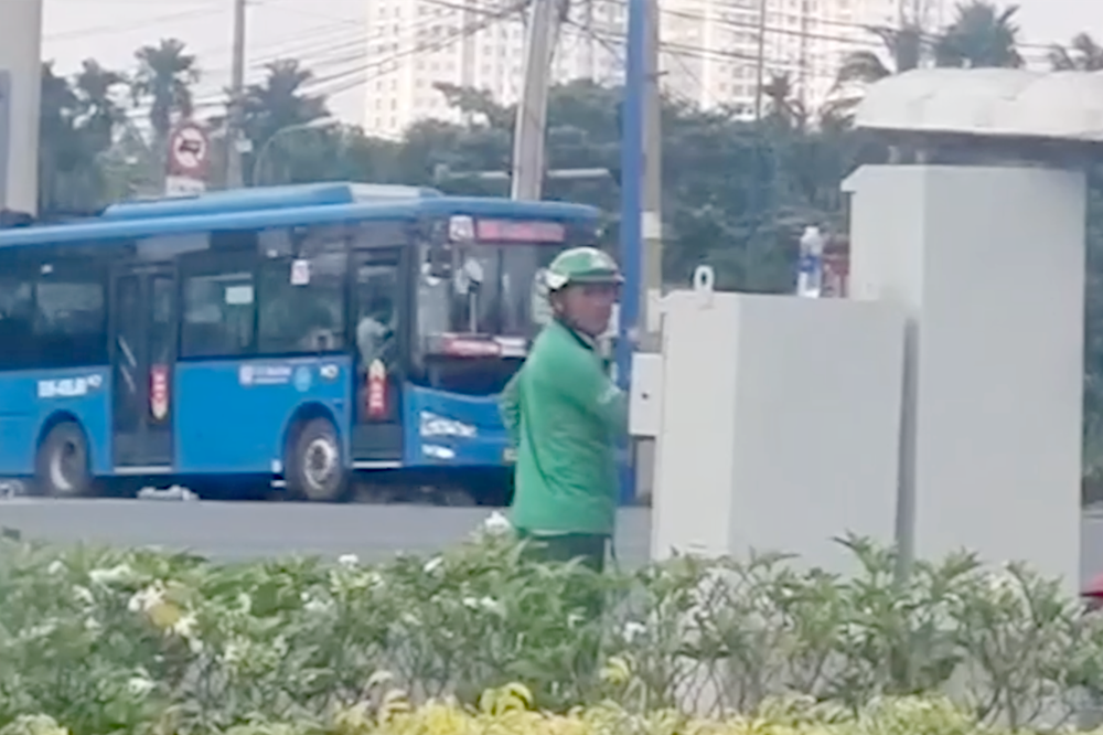 Trước đó, ngày 17/1, trên mạng xã hội lan truyền clip ghi lại cảnh người đàn ông mặc áo và đội mũ bảo hiểm xe ôm công nghệ đứng sát tủ điều khiển tín hiệu giao thông tại giao lộ Võ Nguyên Giáp – Đỗ Xuân Hợp, TP.Thủ Đức.