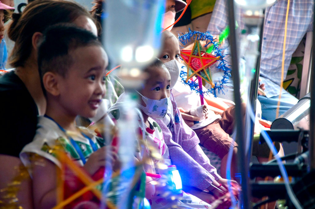 Một tay chằng chịt dây chuyền, mũi tiêm, một tay cầm đèn ông sao ngân nga theo tiếng nhạc, khoảnh khắc này giúp các em quên đi những đau đớn của bệnh tật, hòa mình vào bầu không khí trung thu của các bạn nhỏ nơi đây.