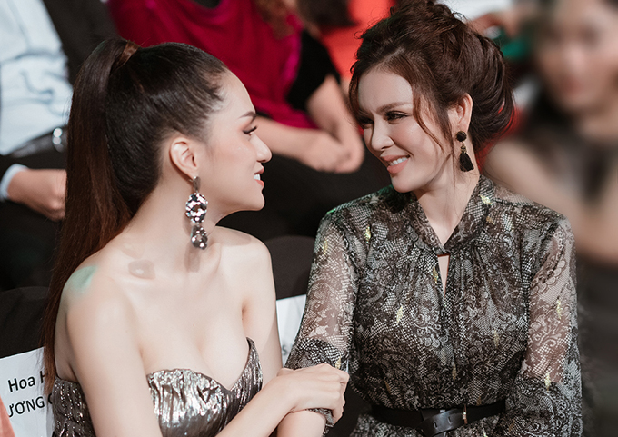 Hoa hậu chuyển giới Hương Giang cũng là nhân vật được nhiều ống kính săn đón trong event tối qua. Cô triệt để khoe vòng 1 nóng bỏng với váy cúp ngực. Hương Giang được xếp ngồi cùng 'đàn chị' Lý Nhã Kỳ trên hàng ghế đầu tiên để xem show thời trang.