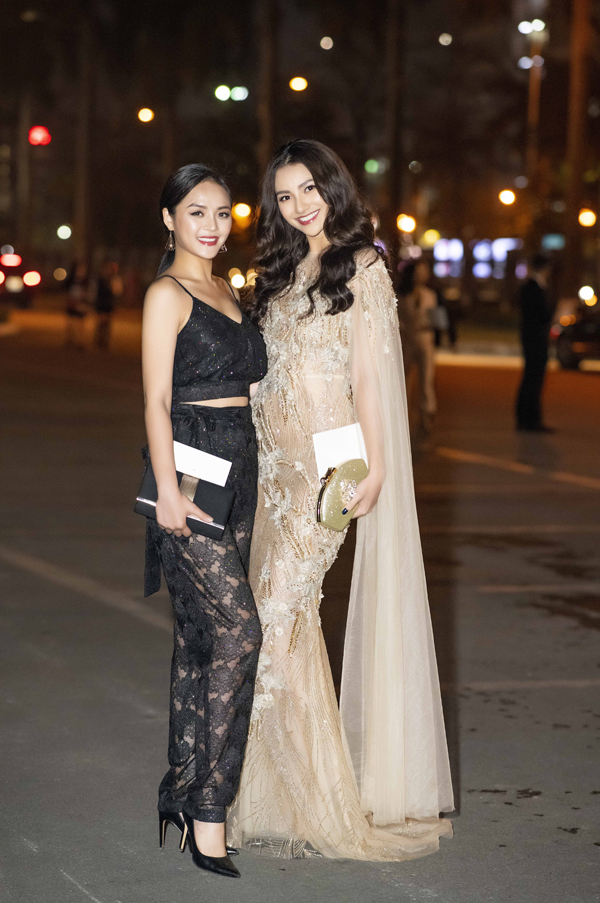 Thu Quỳnh (trái) khác lạ khi chọn trang phục ren xuyên thấu và hở eo, còn Hồng Quế lại lộng lẫy như nữ thần với đầm của NTK Hà Duy.
