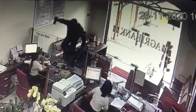 Chưa dừng lại ở đó, kẻ lạ mặt tiếp tục cầm vật màu đen uy hiếp 2 nhân viên ngân hàng phải đi vào phía sau, rồi leo qua vách kính trên quầy giao dịch vào bên trong để lục tìm tiền. Sau một lúc tìm kiếm nhưng vẫn chưa thấy tiền, nghe tiếng báo động, tên cướp chạy ra ngoài, leo lên xe máy dựng sẵn rồi tẩu thoát.