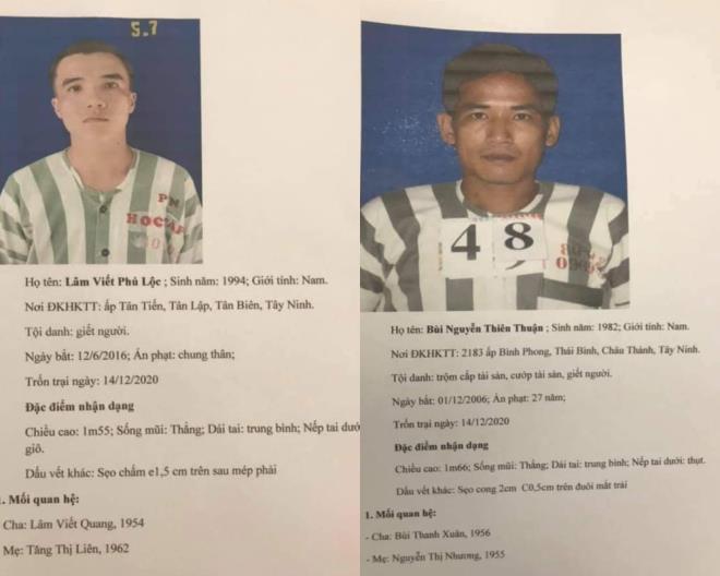 Ngày 14/12, Trại giam Cây Cầy (xã Tân Lập, huyện Tân Biên, tỉnh Tây Ninh) phát thông báo truy tìm 2 phạm nhân thụ án tại đây đã trốn trại.