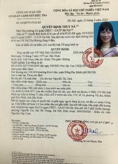Theo Cổng thông tin điện tử Công an Tp.Hà Nội, Cơ quan Cảnh sát điều tra Công an Tp.Hà Nội đã ra Quyết định truy nã đối tượng Vũ Thị Thu Hương (sinh năm 1973; HKTT: P316-B19 Kim Liên, phường Kim Liên, quận Đống Đa, Tp.Hà Nội) về tội Lừa đảo chiếm đoạt tài sản.