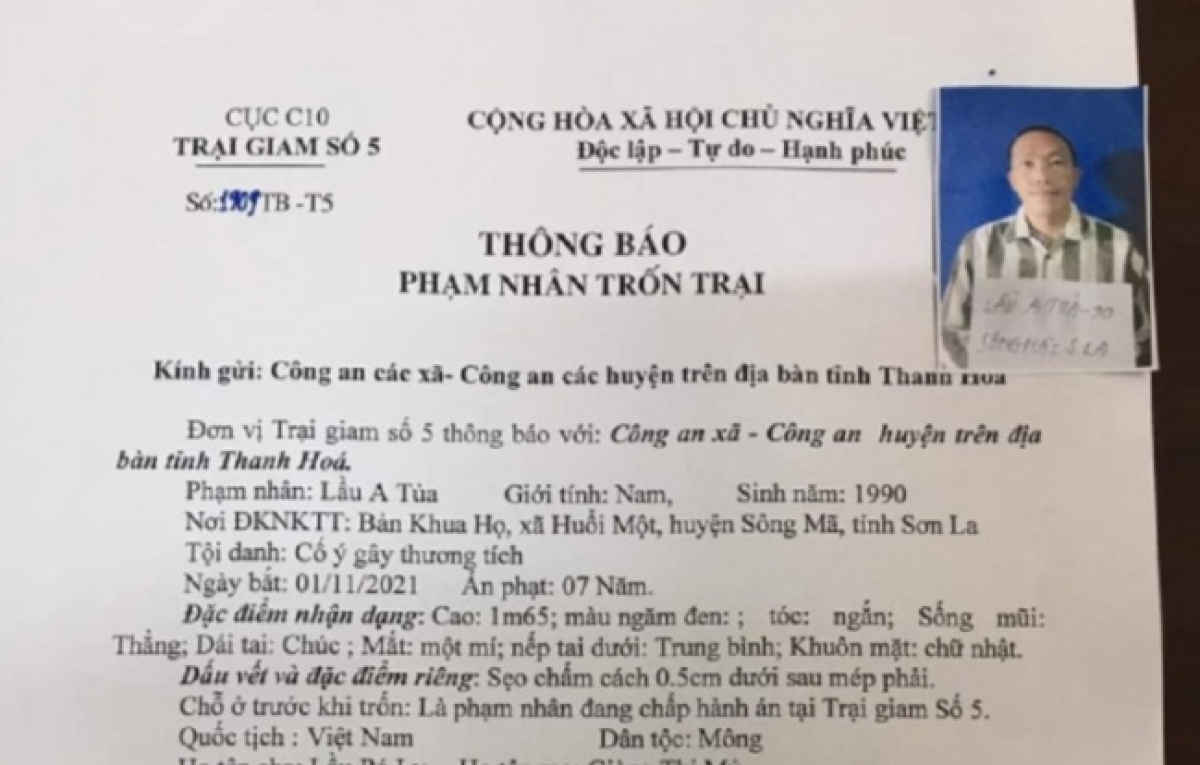Theo Công an nhân dân, thông tin từ Trại giam số 5 cho biết, trước đó, trưa 9/12, lợi dụng quá trình lao động sản xuất, phạm nhân Lầu A Tủa (SN 1990, hộ khẩu thường trú tại bản Khua Họ, xã Huồi Một, huyện Sông Mã, tỉnh Sơn La) đã bỏ trốn khỏi nơi giam giữ .