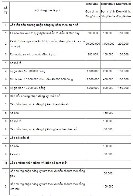 Xe mô tô: Trị giá đến 15 triệu đồng là 1 triệu đồng/lần/xe (Hiện hành là từ 500.000 nghìn đồng - 1 triệu đồng/lần/xe); Trị giá trên 15 - 40 triệu đồng là 2 triệu đồng/lần/xe (Hiện hành là từ 1 - 2 triệu đồng/lần/xe); Trị giá trên 40 triệu đồng là 4 triệu đồng/lần/xe (Hiện hành là từ 2 - 4 triệu đồng/lần/xe).