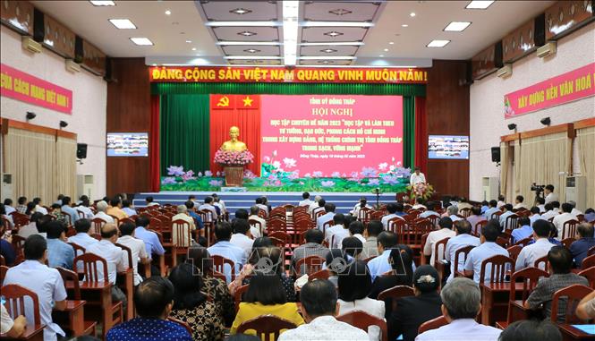 Tỉnh ủy Đồng Tháp tổ chức hội nghị học tập chuyên đề năm 2023 với nội dung “Học tập và làm theo tư tưởng, đạo đức, phong cách Hồ Chí Minh trong xây dựng Đảng, hệ thống chính trị tỉnh Đồng Tháp trong sạch, vững mạnh”. Ảnh: TTXVN