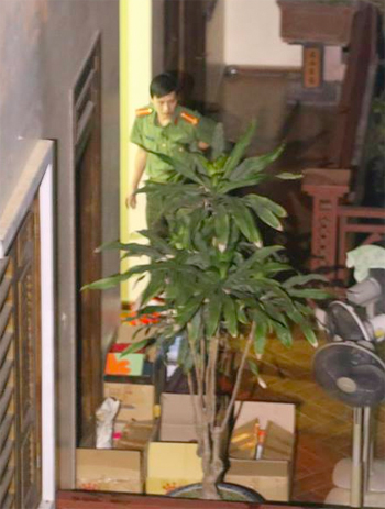 22h45, nhiều thùng đựng tài liệu được cảnh sát vận chuyển ra ban công tầng 2.
