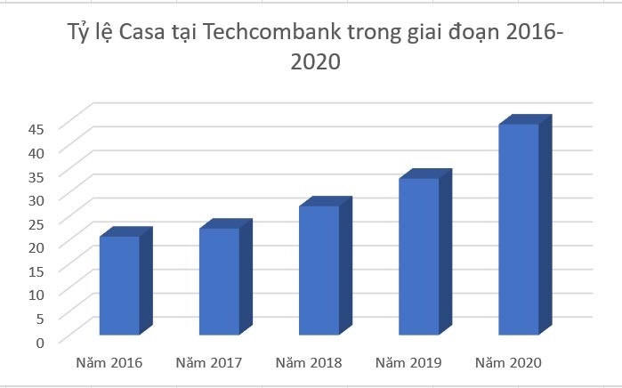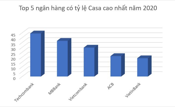 Cụ thể, tại thời điểm 31/12/2020, tỷ lệ Casa tại Ngân hàng TMCP Quân đội (MB), Ngân hàng TMCP Ngoại thương Việt Nam (Vietcombank), Ngân hàng TMCP Á Châu (ACB) và Ngân hàng TMCP Công thương Việt Nam (VietinBank) lần lượt là 39,3%, 30,1%, 21.5% và 19.3%.