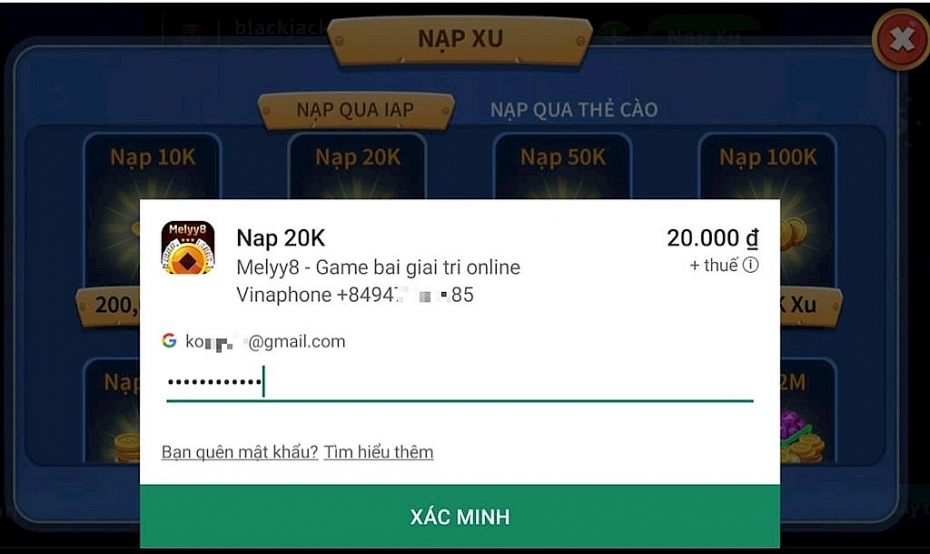 Đơn cử, game đánh bài đổi thưởng Melyy8 hiện cho phép người dùng nạp tiền qua thẻ cào của nhà mạng và nạp qua Google. Theo đó, người dùng game này có thể nạp qua IAP bằng cách sử dụng số thuê bao di động để mua thêm xu, tiền sẽ bị trừ trực tiếp vào tài khoản…