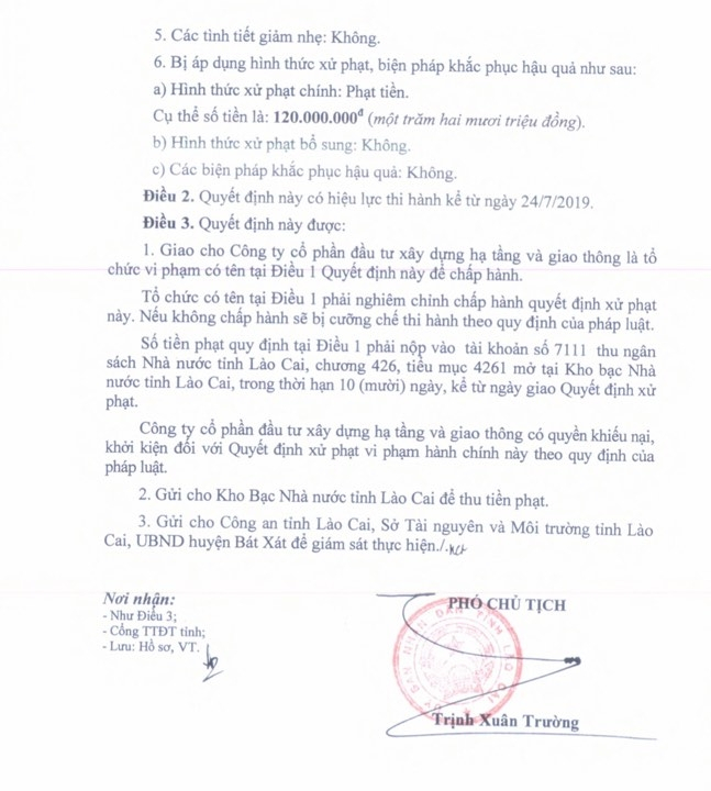 Theo đó, UBND tỉnh Lào Cai xử phạt 120 triệu đồng nộp Kho bạc Nhà nước tỉnh Lào Cai.