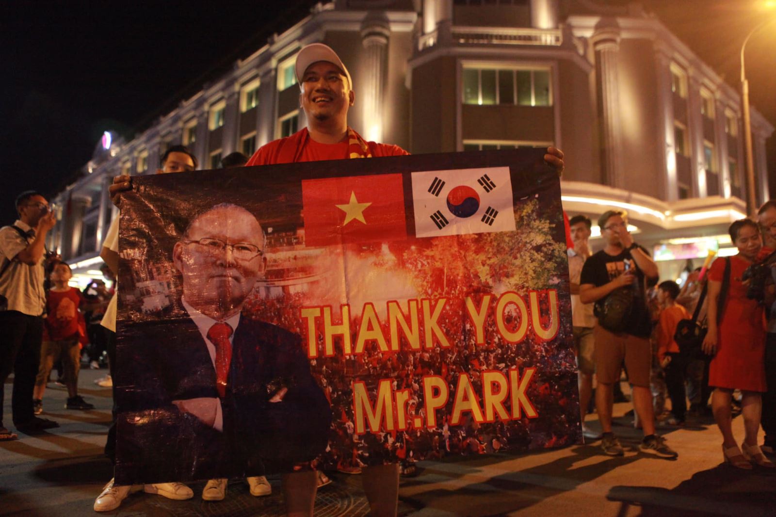 Nhiều cổ động viên đã thể hiện lòng biết ơn tới người thầy Park Hang Seo, giơ cao tấm cờ Hàn Quốc cùng lời "Caem ơn thầy Park".