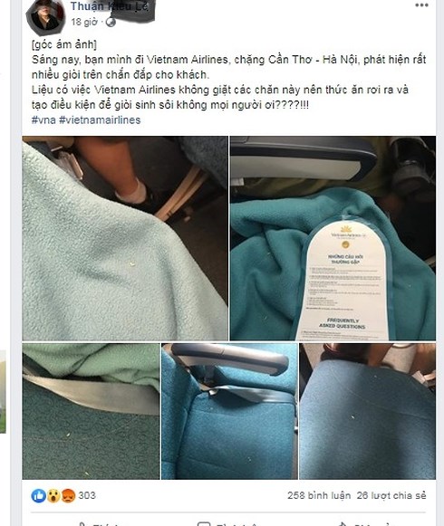 Ngày 22/7, một tài khoản facebook có tên Thuận Kiều Lê bất ngờ chia sẻ rầm rộ thông tin phát hiện chăn trên máy bay Vietnam Airlines có giòi, gây xôn xao dư luận.