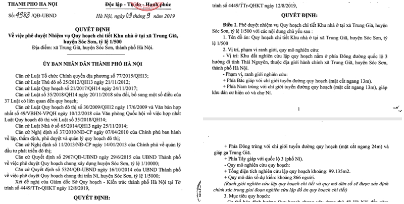 UBND TP.Hà Nội vừa ban hành Quyết định số 4983 phê duyệt Nhiệm vụ Quy hoạch chi tiết Khu nhà ở tại xã Trung Giã, huyện Sóc Sơn tỷ lệ 1/500 tại xã Trung Giã, huyện Sóc Sơn. Quyết định này đang khiến dư luận xôn xao bởi đơn vị được giao tổ chức lập quy hoạch là Tổng Công ty Cổ phần Thương mại Xây dựng (Vietracimex), đơn vị đã chậm tiến độ xây dựng khu đô thị Kim Chung – Di trạch ở huyện Hoài Đức hơn 10 năm qua, gây lãng phí tài nguyên đất…