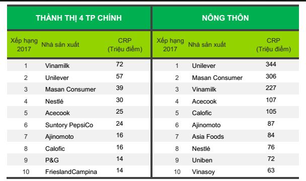 Theo bản báo cáo Brand Footprint (Dấu chân thương hiệu) của Kantar World Panel vừa công bố năm 2018, với chỉ số Điểm Tiếp Cận Người Tiêu Dùng (Consumer Reach Points - CRPs*) cao vượt trội so với các thương hiệu khác trong bảng xếp hạng, Vinamilk tiếp tục là thương hiệu được chọn mua nhiều nhất tại Việt nam 4 năm liên tiếp 2014 - 2017 (khu vực thành thị 4 thành phố chính). Ngoài ra, cũng theo báo cáo này, Vinamilk 4 năm liên tiếp 2014 - 2017 nằm trong top 3 nhà sản xuất sở hữu các thương hiệu được chọn mua nhiều nhất ở cả 4 thành phố và khu vực nông thôn Việt Nam trong nhóm hàng tiêu dùng nhanh (FMCG).
