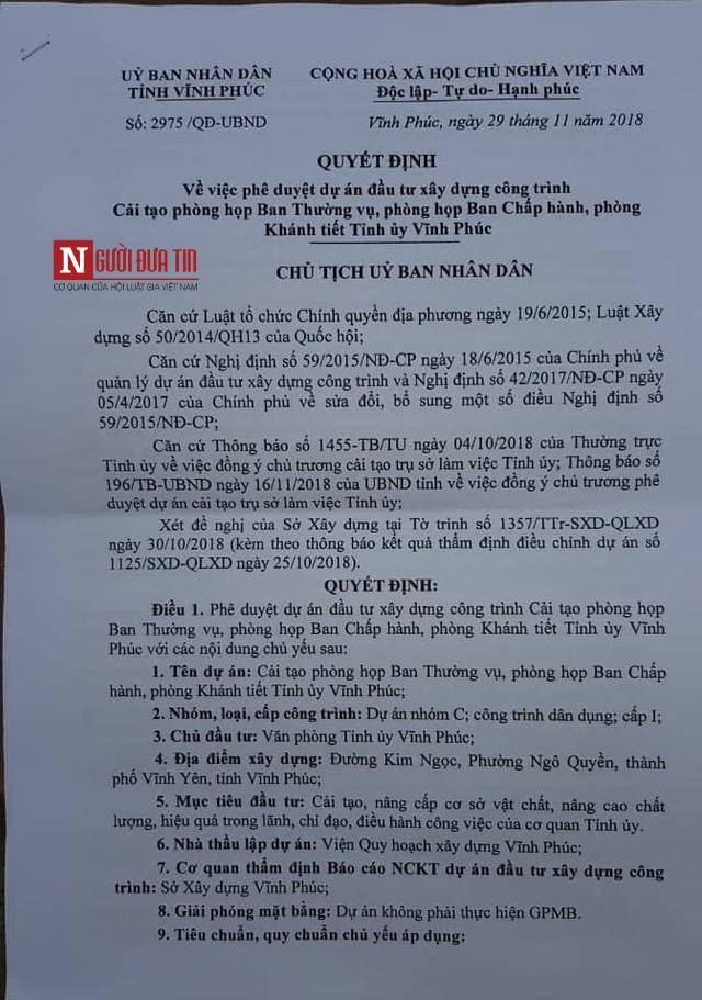 Ngày 29/11/2018, UBND tỉnh Vĩnh Phúc có Quyết định số 2975 về việc phê duyệt dự án đầu tư xây dựng công trình cải tạo phòng họp Ban Thường vụ, phòng họp Ban Chấp hành, Phòng Khánh tiết Tỉnh ủy Vĩnh Phúc. Tổng mức đầu tư của dự án gần 18 tỷ đồng (17.955.812000 đồng). Nguồn kinh phí được lấy từ kinh phí sự nghiệp năm 2018. Thời gian thực hiện 2018- 2019.