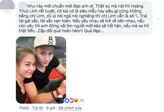 Thậm chí, rất nhiều người hâm mộ của cặp đôi vẫn nuôi hy vọng họ trở về bên nhau. "Thật sự mà nói thì Hoàng Thuỳ linh rất tuyệt. Cô gái kia có là siêu mẫu hay siêu gì cũng không bằng chị Linh.