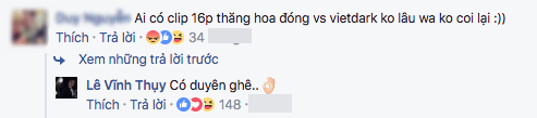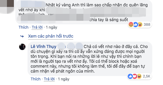 Trước lời lẽ chỉ trích bạn gái cũ, Vĩnh Thụy ra mặt bảo vệ: "Chả có vết nhơ nào ở đây cả. Cho dù chuyện gì xảy ra thì cô ấy vẫn xứng đáng được mọi người tôn trọng. Khi bạn nói ra những lời lẽ như vậy, chính bạn mới là người tạo ra vết nhơ ấy. Tôi có thể block hoặc xóa comment này nhưng tôi không làm thế. Tôi để đây để bạn tự cảm nhận về phát ngôn của mình".