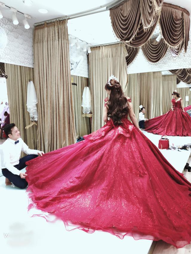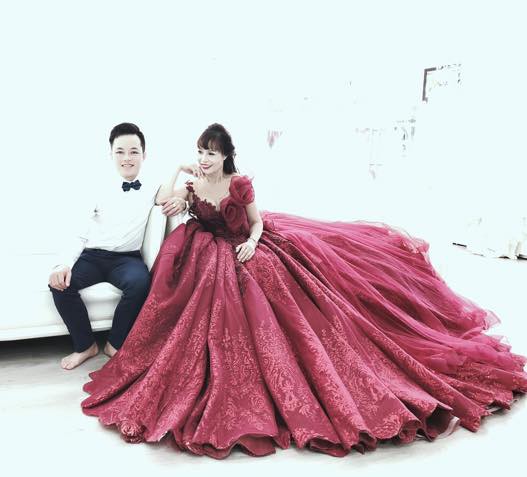 Trọng bộ váy cưới trễ vai màu đỏ khá sang trọng và lộng lẫy, cô dâu Thu Sao nở nụ cười hạnh phúc bên người chồng trẻ. Dù đã trang điểm đậm, nhưng trên gương mặt chị Thu Sao vẫn lộ rõ dấu ấn của tuổi tác bởi những nếp nhăn, tuy nhiên chị vẫn tự tin tạo dáng và chụp hình.