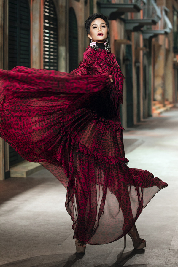 H'Hen Niê diện bodysuit bên trong, kết hợp với áo chiffon tạo dáng uyển chuyển. Hoạ tiết da báo phù hợp với sự năng động, mạnh mẽ và có phần phóng khoáng của hoa hậu người Ê đê.