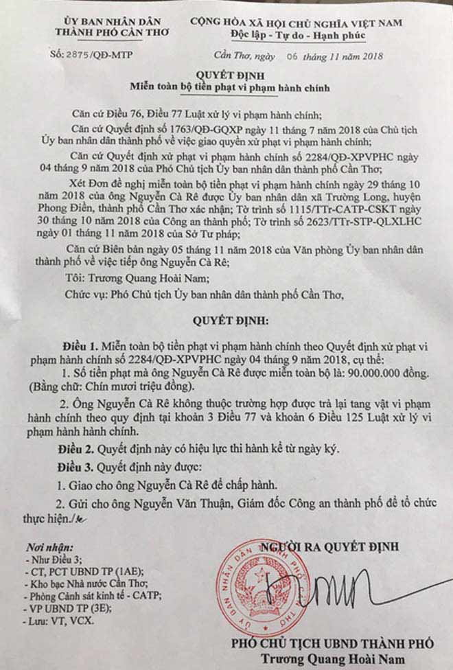Ngày 7/11, theo nguồn tin của phóng viên Báo Người Lao Động, trong ngày hôm qua, ông Trương Quang Hoài Nam, Phó Chủ tịch UBND TP Cần Thơ, đã ký Quyết định số 2875/QĐ-MTP, miễn toàn bộ tiền phạt vi phạm hành chính 90 triệu đồng cho ông Nguyễn Cà Rê (thợ điện; 38 tuổi; ngụ phường An Hoà, quận Ninh Kiều) theo Quyết định xử phạt vi phạm hành chính số 2284/QĐ-XPVPHC ngày 4/9/2018 do ông Nam ký trước đó.