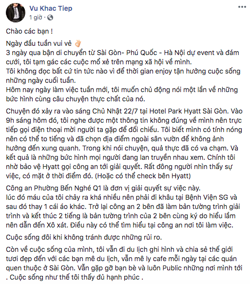 Những ngày vừa qua, hình ảnh Vũ Khắc Tiệp người be bét máu ở đồn công an đang khiến dân tình đặc biệt quan tâm. Ngay thời điểm diễn ra ồn ào, Vũ Khắc Tiệp chỉ lên tiếng giải thích đó là những hình ảnh "thời nông nổi đi bar" đã từ rất lâu. Tuy nhiên, khi liên tục bị dân mạng soi ra những điểm thiếu hợp lí, Vũ Khắc Tiệp đã chính thức lên tiếng giải thích rõ thực hư sự việc.
