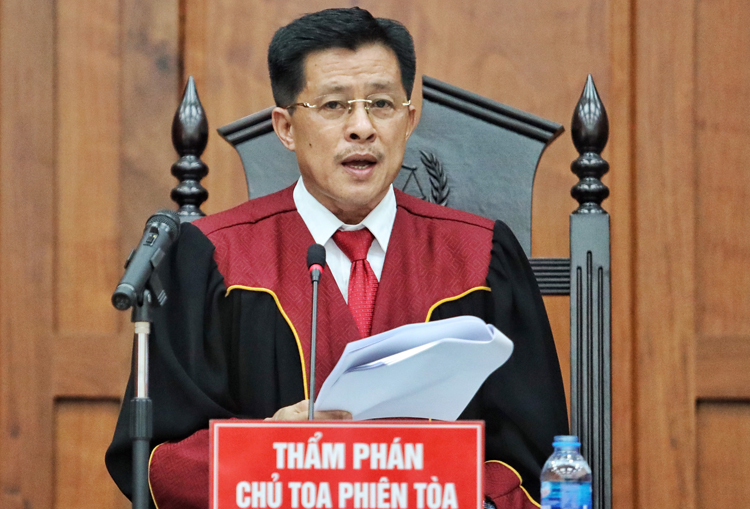 Trong một tiếng đầu phiên làm việc, chủ tọa Nguyễn Hữu Ba tóm tắt lại nội dung vụ án, quan điểm bên buộc tội và gỡ tội.
