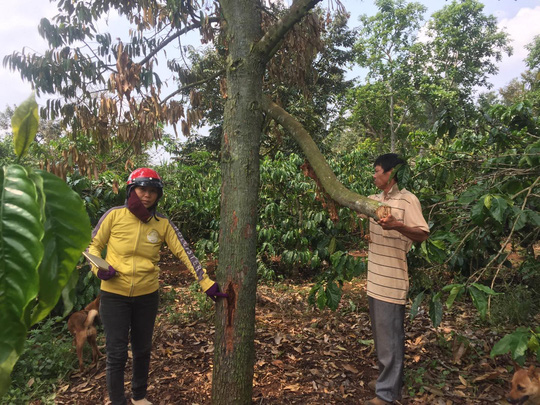 Chị Thủy cho biết, vào ngày 30/4, chị ra thăm rẫy thì tá hỏa phát hiện vườn cây sâu riêng gồm 12 cây đang cho thu hoạch và 10 cây sầu riêng (3 năm tuổi) bị chết cành, rụng hoa. Kiểm tra, chị phát hiện những gốc cây này đều bị đục nhiều lỗ trên thân, cành và phần gốc.