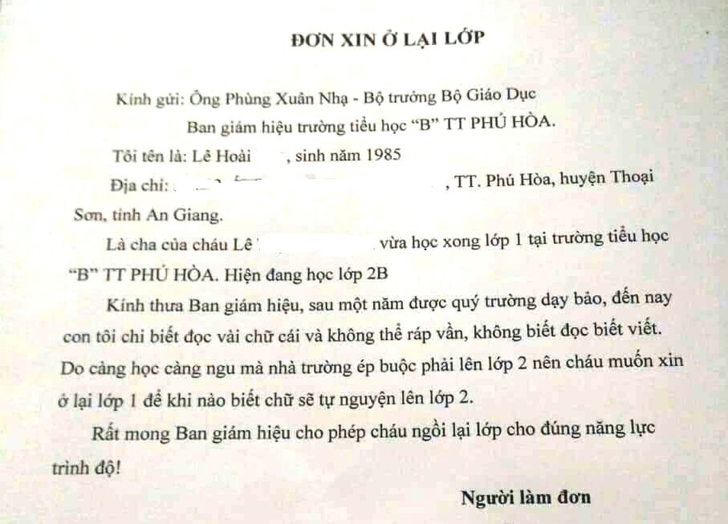 Theo lá đơn, anh Lê Hoài H. (SN 1985, ngụ thị trấn Phú Hòa, huyện Thoại Sơn, tỉnh An Giang) bày tỏ nguyện vọng xin cho con gái anh đang học tại trường Tiểu học B thị trấn Phú Hòa được lưu ban, học lại lớp 1 thay vì tiếp tục theo học chương trình lớp 2.