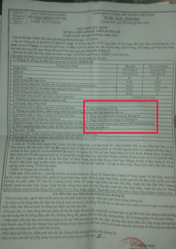 Ông Sơn cho rằng, xe của ông không vi phạm chở quá khổ, quá tải. Tuy nhiên, đối chiếu Giấy phép lưu hành xe quá khổ giới hạn trên đường bộ mà Sở GTVT tỉnh Quảng Bình cấp cho Công ty TNHH Cơ Khí Hải Sơn ngày 27/2/2018 và cây khủng mà công ty này chở, thì doanh nghiệp sai phạm rất rõ. Cụ thể, theo giấy phép lưu hành được cấp phép thì hàng vượt sau thùng xe là 0m, nhưng chiếc xe chở cây khủng thừa đến vài mét, gây nguy hiểm khi lưu thông.