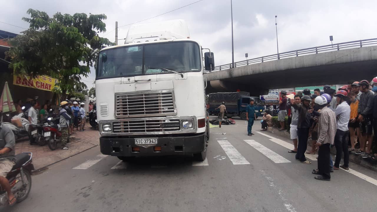 Xe máy đổ xuống đường, nữ nạn nhân (khoảng 35 tuổi) bị xe đầu kéo cán tử vong, người đàn ông may mắn thoát nạn.