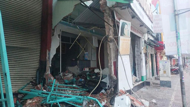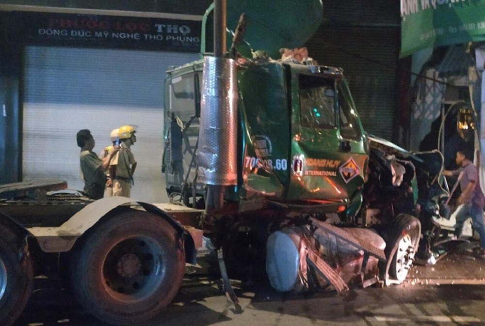 Tại hiện trường, phần cabin xe đầu kéo nằm lọt trong nhà dân, hư hỏng nặng. Mảng tường nhà dân vỡ nát.