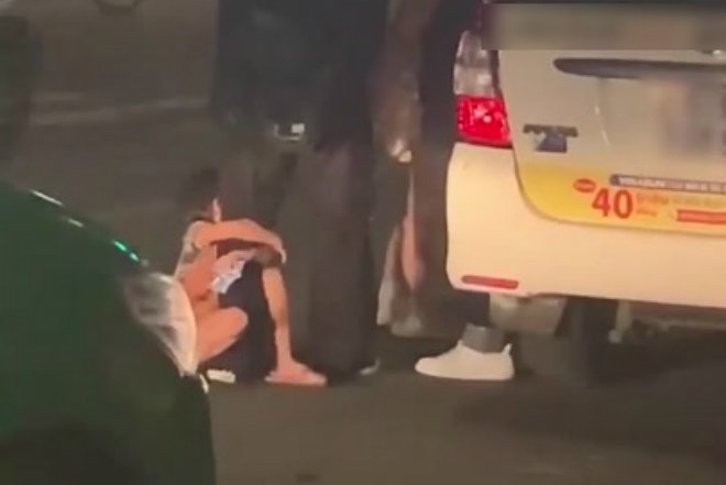 Đoạn clip ghi lại cảnh một bé ôm ghì chân ngăn cản vị khách lên taxi, bé còn lại dùng chân đá nhóm du khách với vẻ bực bội.