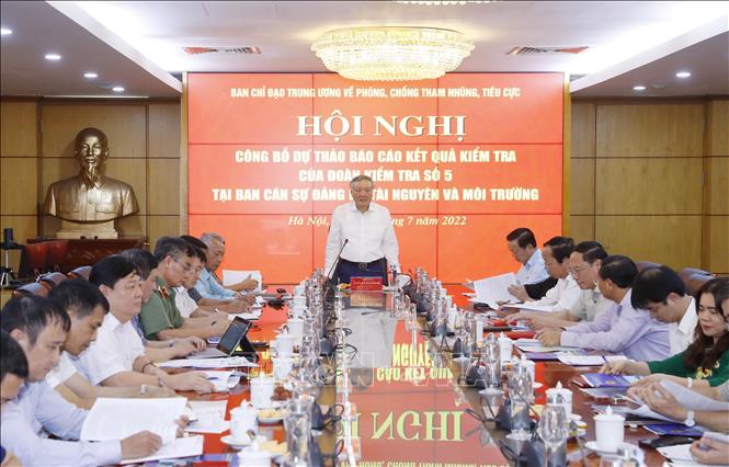 Tại Bộ Tài nguyên và Môi trường, Đoàn kiểm tra số 5 đã tiến hành kiểm tra 2 nội dung: Việc lãnh đạo, chỉ đạo, tổ chức thực hiện công tác phát hiện, chuyển giao, tiếp nhận, giải quyết tố giác, tin báo về tội phạm, kiến nghị khởi tố các vụ việc có dấu hiệu tội phạm về tham nhũng, kinh tế, tiêu cực (tại 6 cơ quan, đơn vị từ ngày 8 - 17/6); việc lãnh đạo, chỉ đạo, tổ chức thực hiện công tác giám định, định giá tài sản trong giải quyết các vụ án, vụ việc tham nhũng kinh tế, tiêu cực (tại 4 đơn vị từ ngày 8 - 20/6).