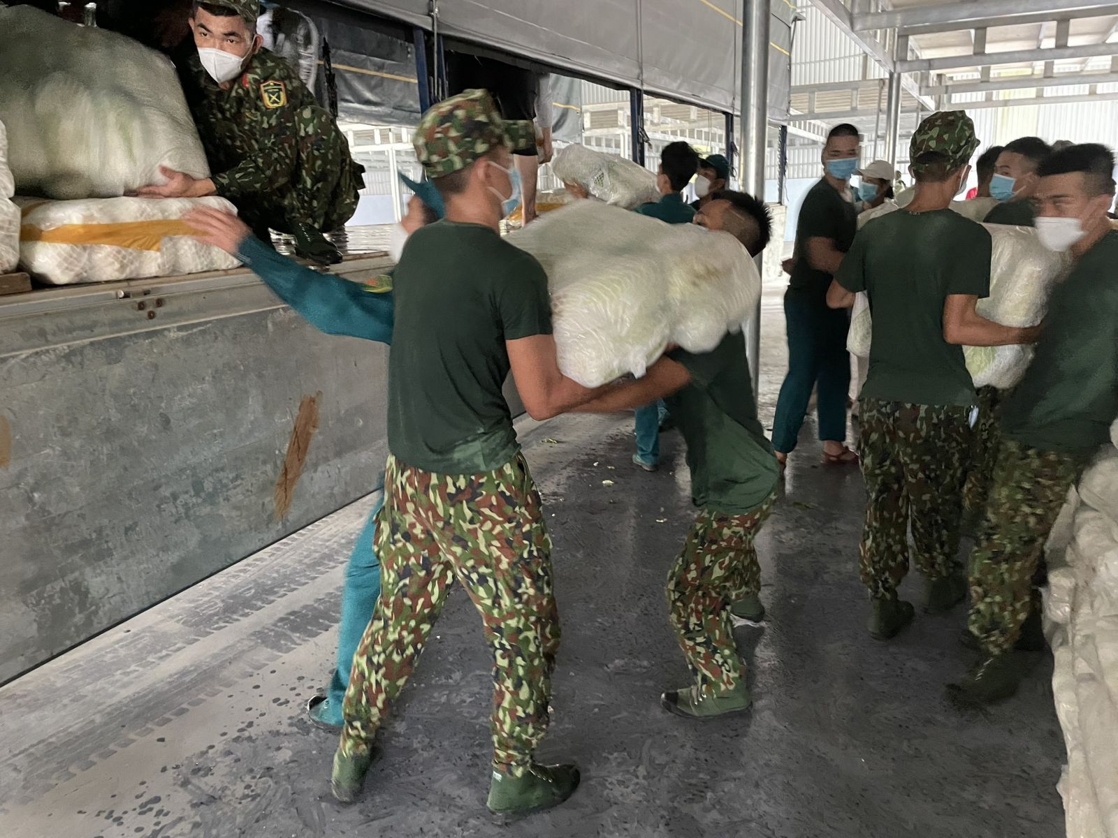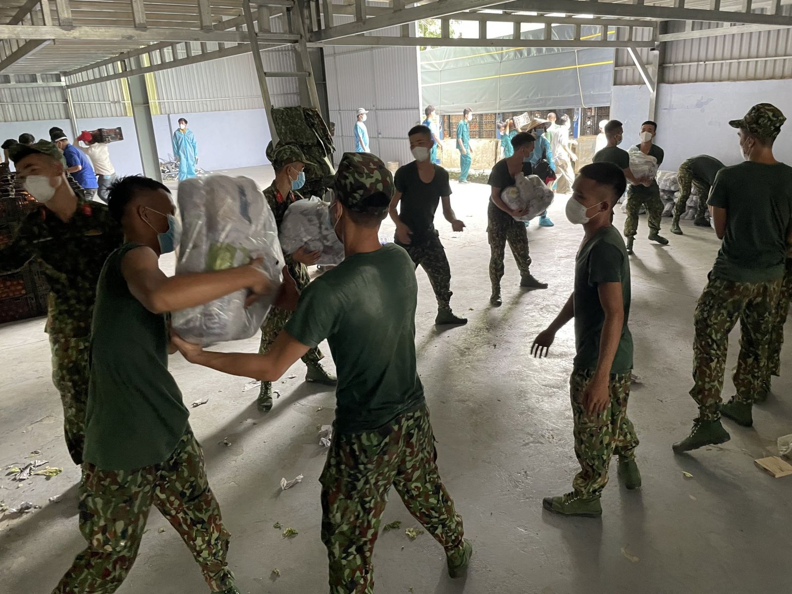 Các chuyến sĩ Quân đội đang vận tải hàng từ xe tải xuống các kho ở Tp.Thuận An và thị xã Tân Uyên để chuẩn bị quá trình phân chia lương thực thành từng túi.