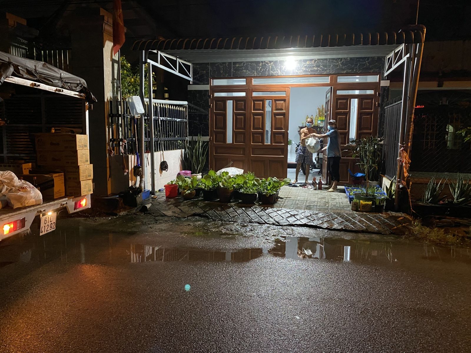 Một người dân nhận nhu yếu phẩm trong đêm.